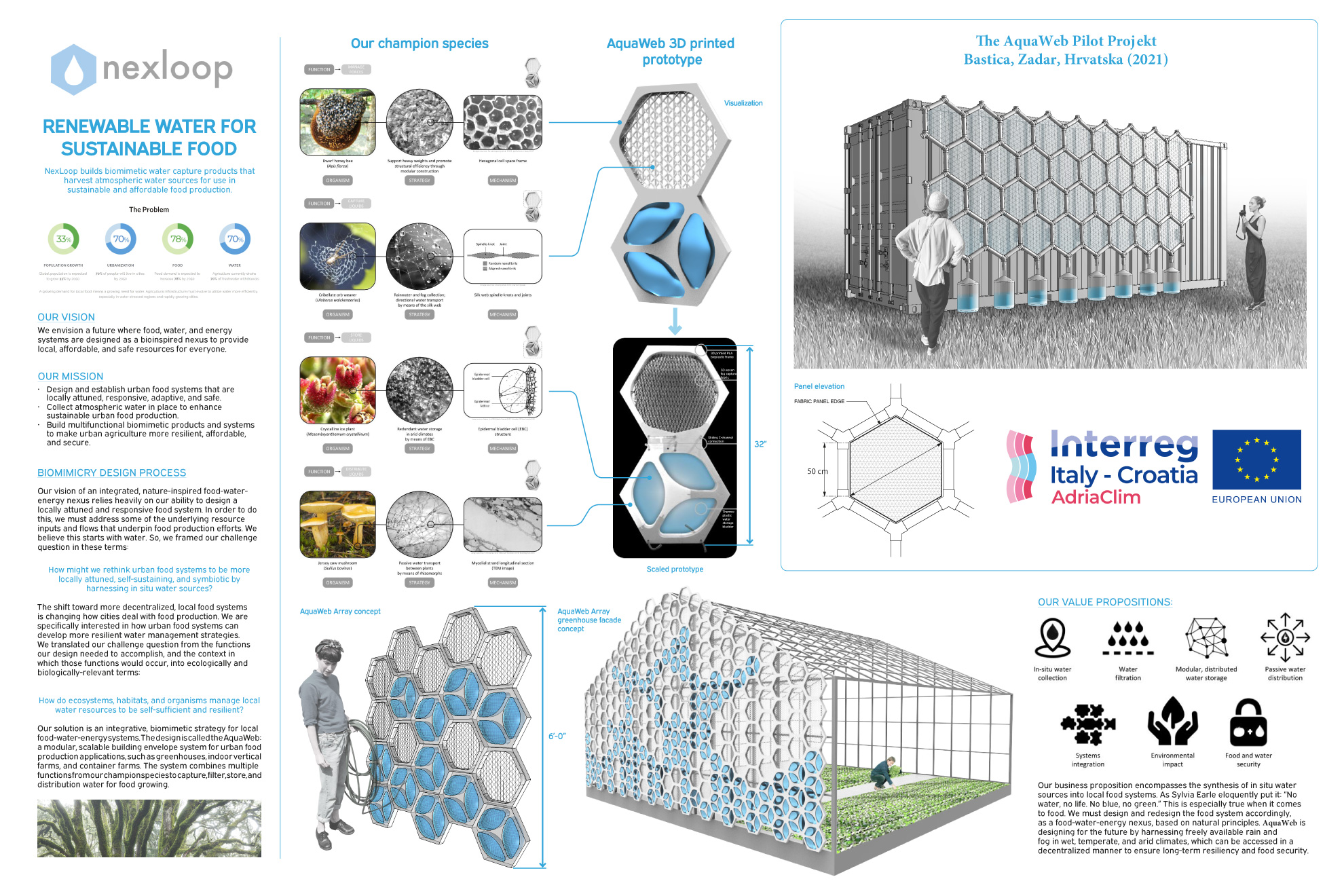 Nello specifico, si tratta di una serie di pannelli dalla forma esagonale – simile a quella dei favi degli alveari – attualmente appesi ad una parete esterna in una struttura di proprietà dell’università di Zara. La forma esagonale ha dimostrato di essere la più efficiente nel sopportare pesi consistenti, e la costruzione modulare aumenta l’efficienza strutturale. Per l’assorbimento dell’acqua, lo strumento si rifà invece allo stesso principio delle tele di ragno. Abbiamo parlato con Andrea Vitlov-Kurtin dell’Agenza Regionale per lo Sviluppo Zadra Nova che ci ha spiegato il funzionamento di questa incredibile “ragnatela”.